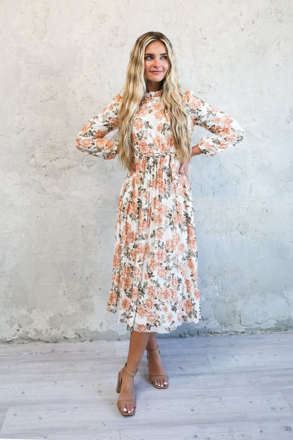 Indulge in luxury with this floral print dress in tones of peach, coral, and sage greens on a cream colored background. The feminine and classy design boasts a flattering pleated skirt, high-quality polyester fabric, and a matching tie waist to accentuate your natural curves. With a mock neck and long sleeves, this dress exudes sophistication and elegance. Elevate your wardrobe with this exclusive piece.