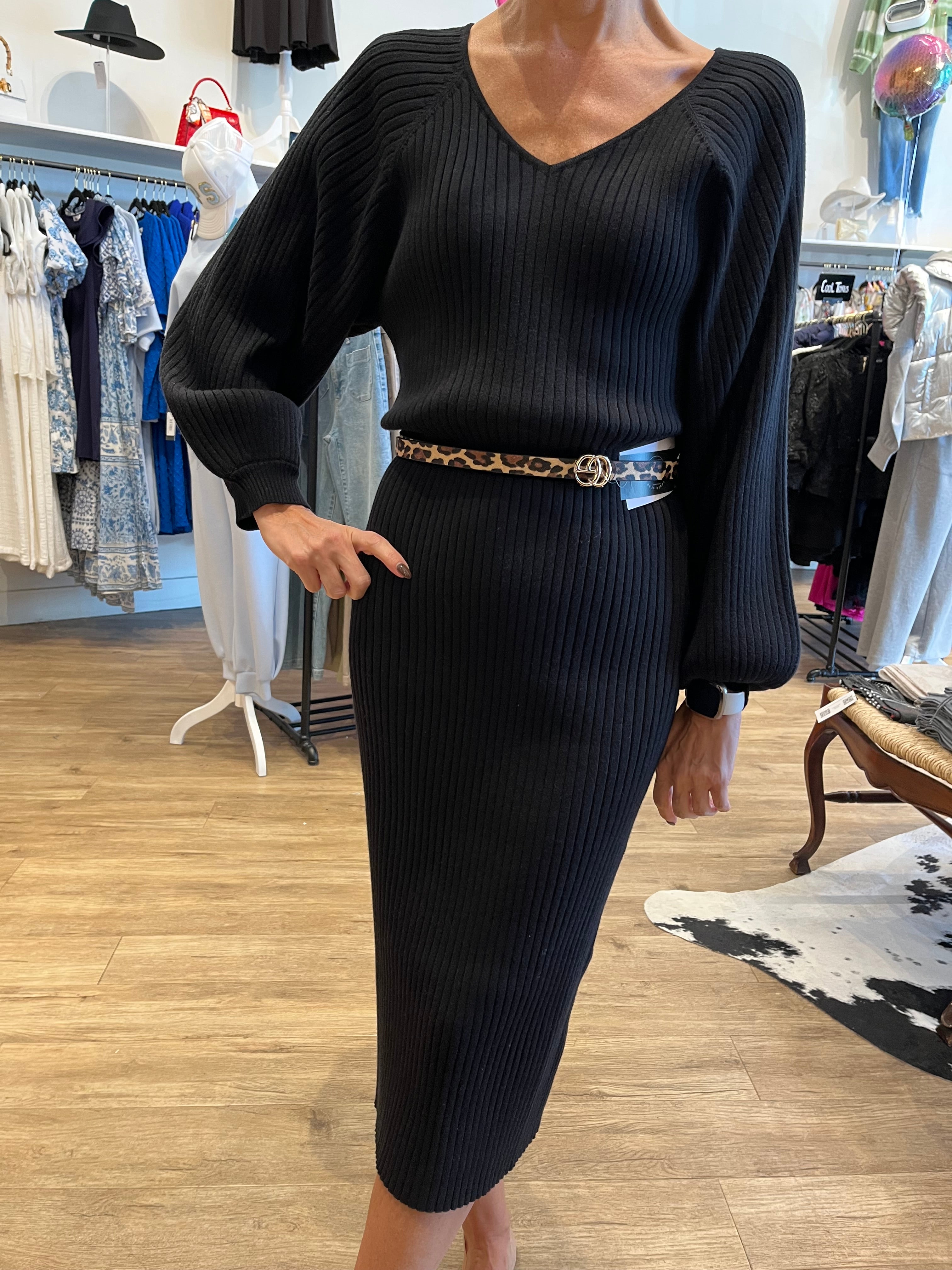 Indulge in luxury with the Romee- Black full-length ribbed sweater dress. Its elegant design boasts long balloon sleeves, a flattering v-neckline, and a timeless black color. Perfect for staying warm and stylish during the cooler months, this dress will become a staple in your wardrobe.