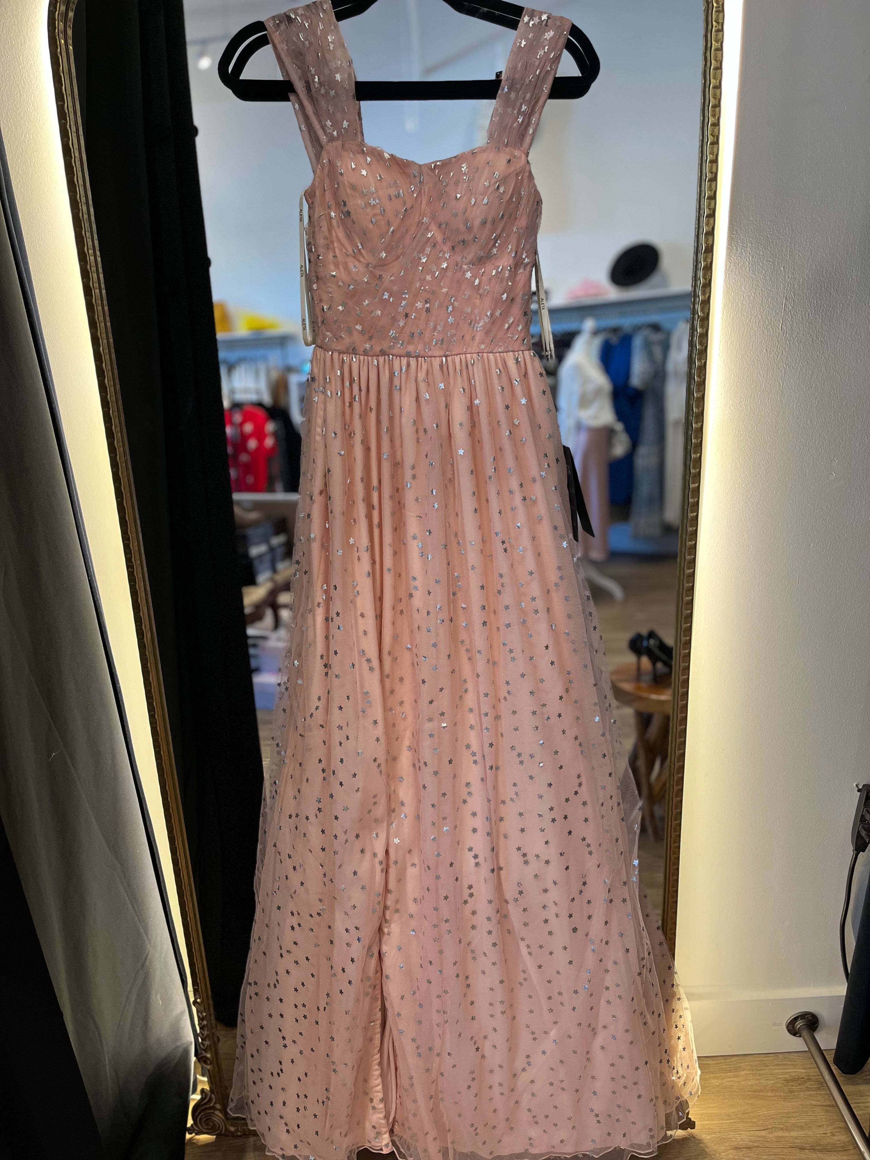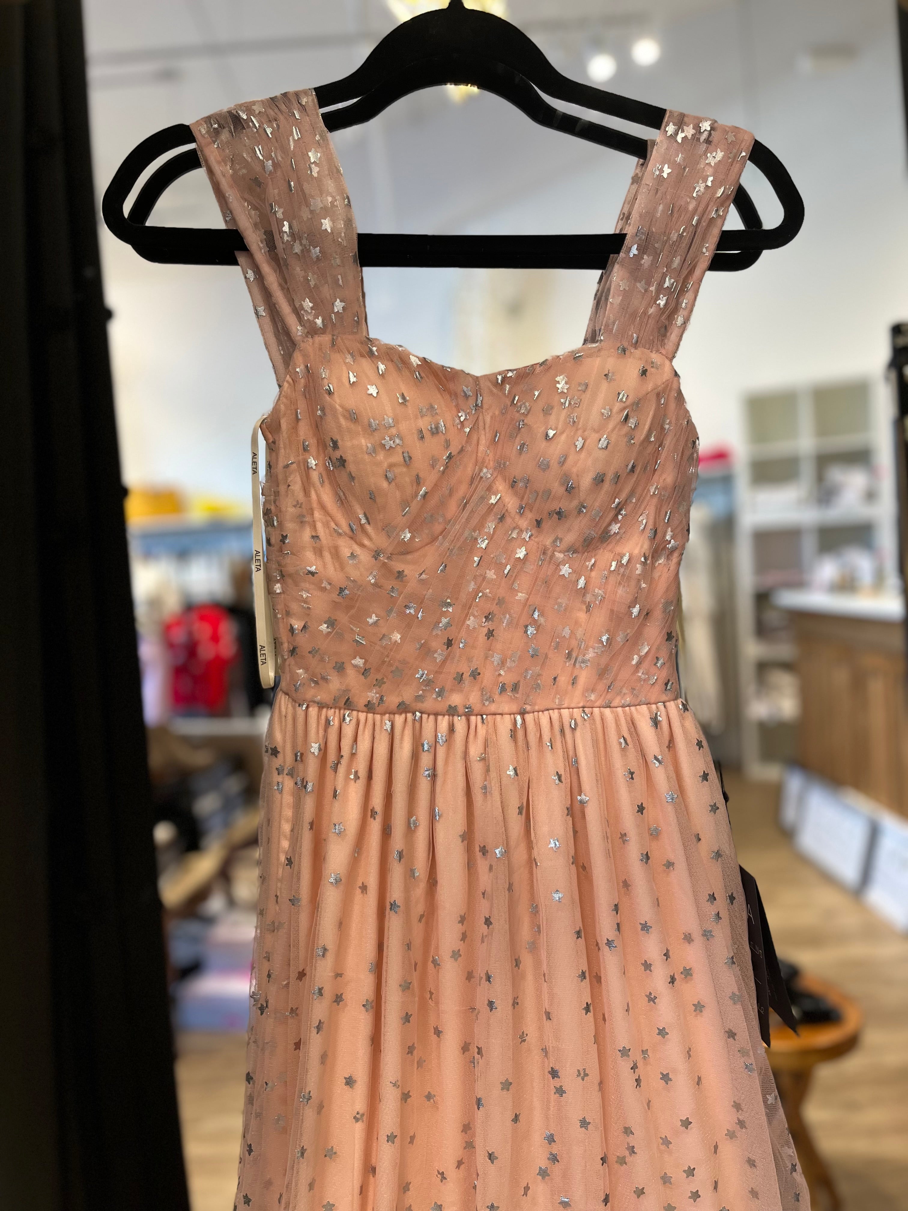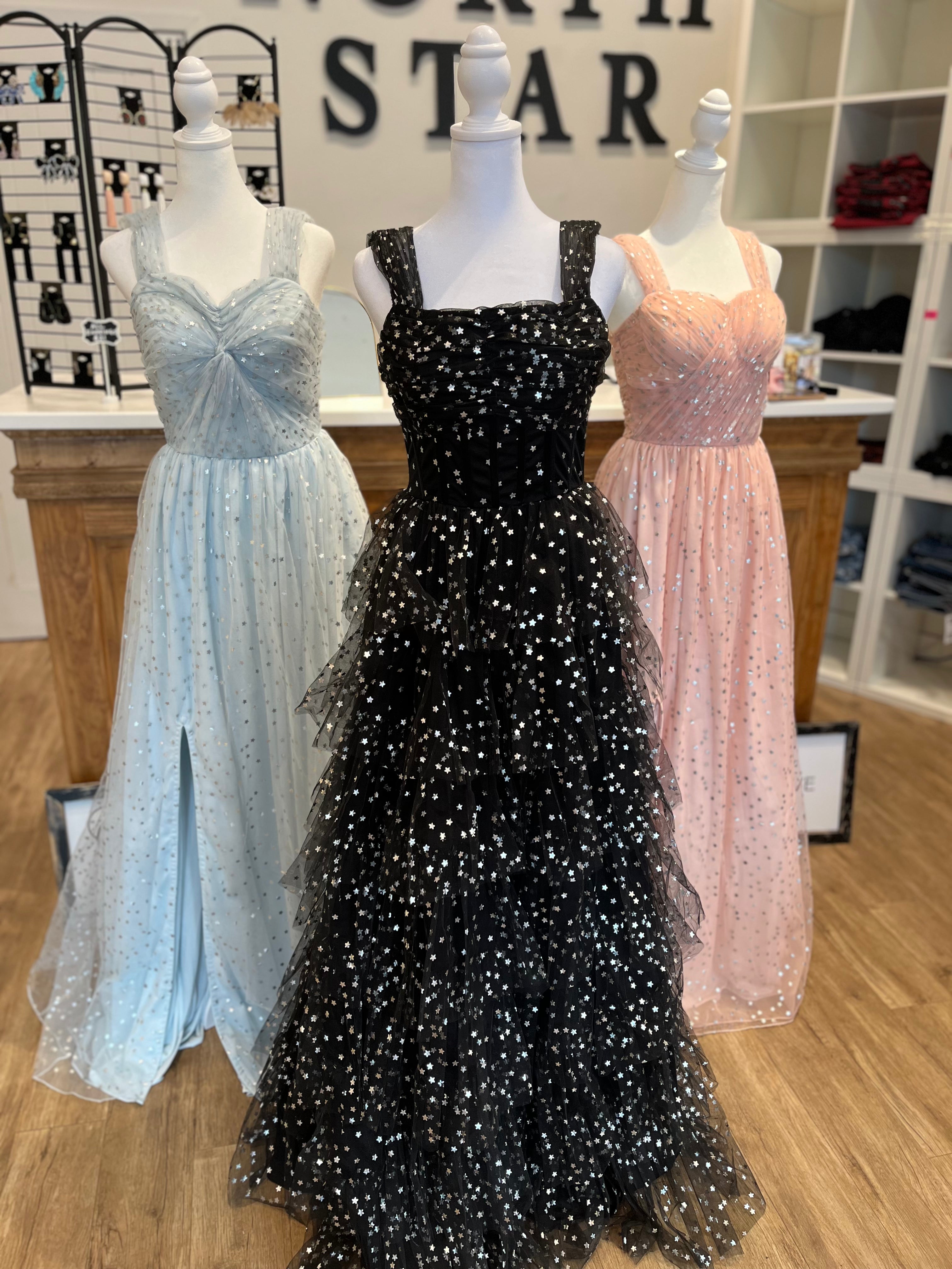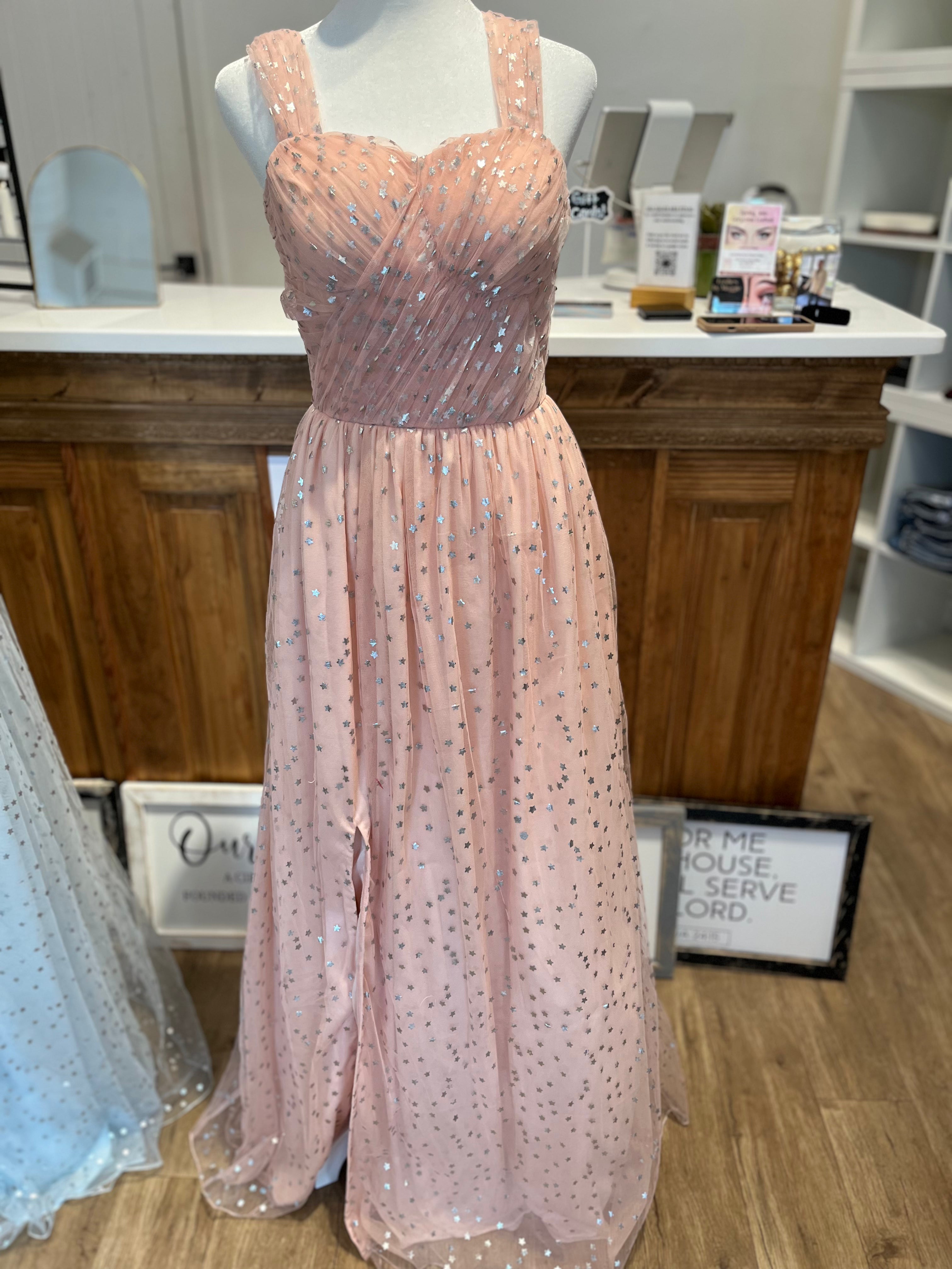 Introducing our new formal dress adorned with a star pattern. The leg slit adds an unexpected touch of elegance, while the lining ensures a comfortable and luxurious fit. Stand out at your next event with this sophisticated and exclusive dress.