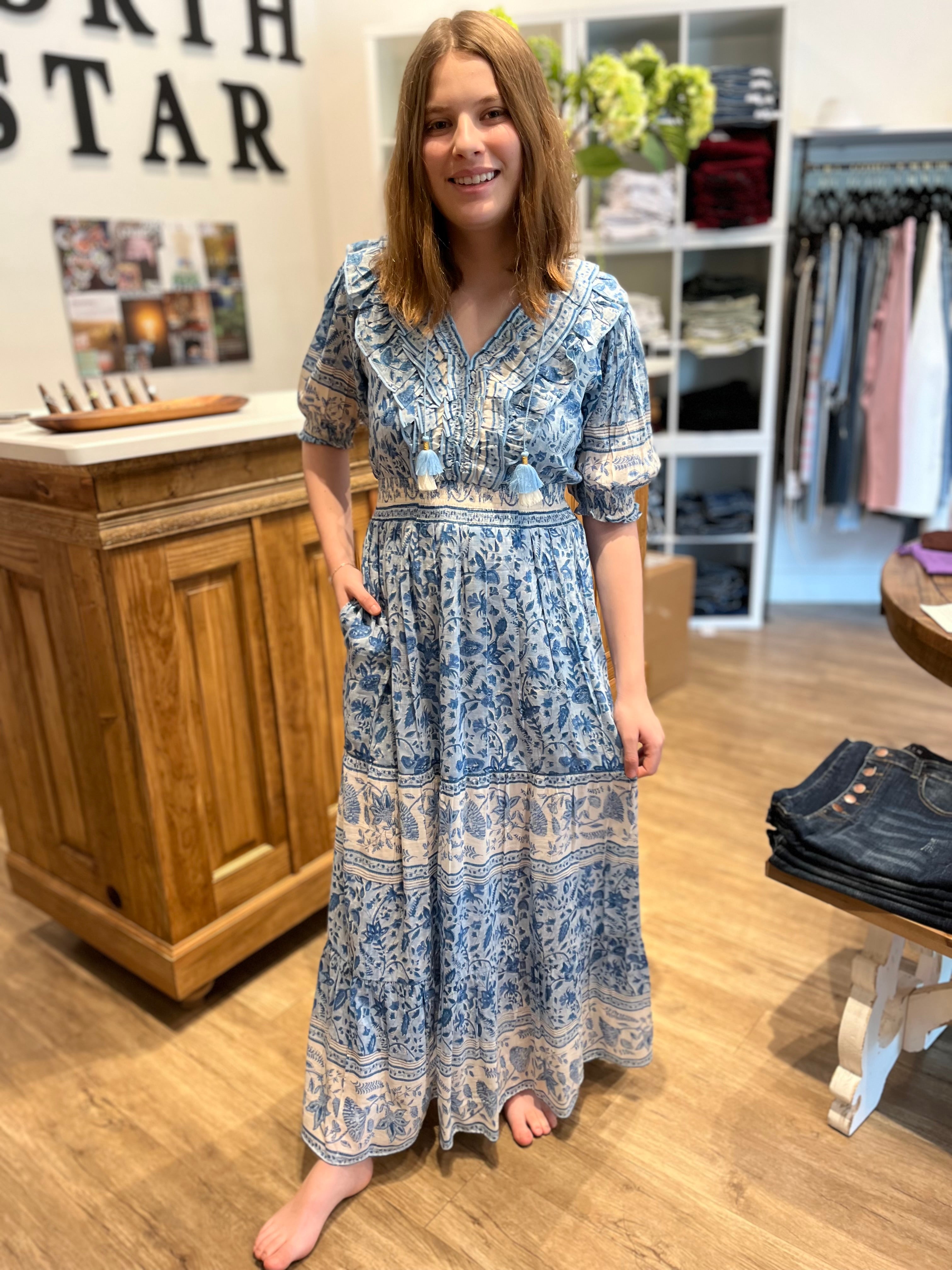 Indulge in the luxury of our High Tea Dress in Blue. Made from sustainable fabric, this maxi dress features elbow-length puff sleeves with elastic cuffs, a romantic ruffle-embellished V-neckline, and an elastic waist for a comfortable fit. Fully lined, this dress boasts a stunning white and blue floral pattern.